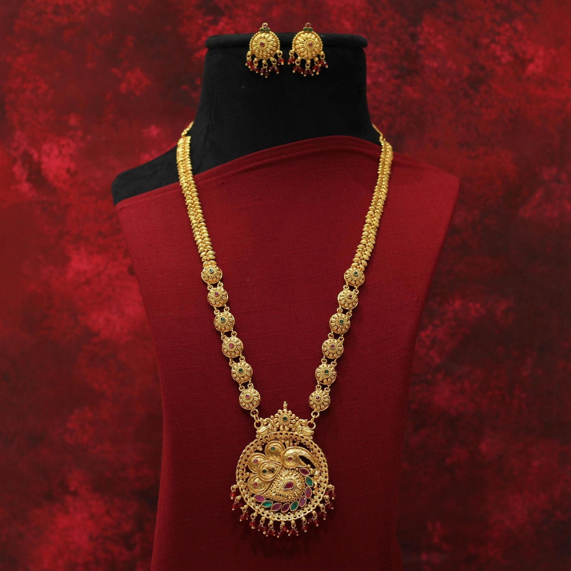 Collections: All Products Long Necklace Set Matt Necklace Set Temple Gheru Necklace Set